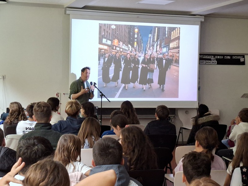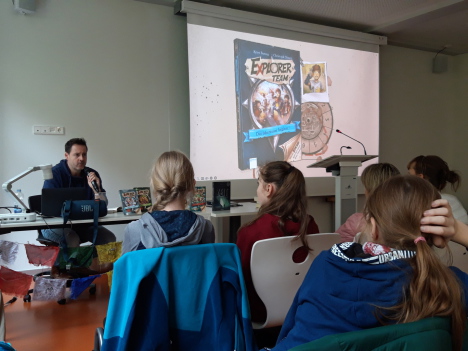 Für das Lesen begeisterte Autor Björn Berenz, die Schülerinen und Schüler der Klassen G 3 und G 4 sowie der sechsten Jahrgangssstufe der Werkreal- und Realschule. Björn Berenz ist Autor der beliebten Reihe "Explorer Team". Das Besondere an den Büchern ist, dass die Leser vergleichbar einem Exit Game oder Escape Room im Lauf der Geschichte Rätsel lösen, knobeln oder basteln. So unterschied sich auch die Lesung von anderen Buchvorstellungen. Björn Berenz wusste die Schülerinnen und Schülern mit zahlreichen kniffligen Aufgaben zu unterhalten und machte damit Lust auf Lesen. Unter anderem verdeutlichte er auch wie sich unser Gehirn manchmal in die Irre führen lässt. Er zeigte etwa Fotos auf denen wir in einer Gruppe von Personen scheinbar das Gesicht von Jesus oder Buchstaben erkennen.