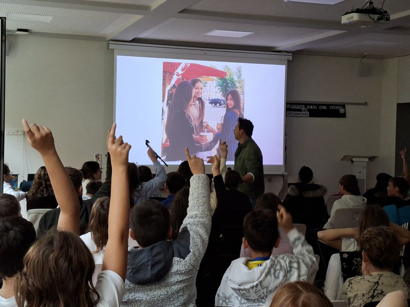 Die Klassen G 4 und R 5b nahmen auf Einladung des Landratsamts Waldshut an der Vorstellung des neuen Buchs "Wir alle" von Heike Faller teil. Die Autorin, die selbst Schülerin der Hans-Thoma-Schule-Laufenburg war, präsentierte den Kindern ihren neuen Titel anhand eines Mitmach-Quiz. "Wir alle" ist eine Art kleine Geschichte der Menschheit, die mit einem Kind im Jahr 2025 den Anfang nimmt und über Eltern und Großeltern rund 30 000 Generationen zurückgeht bis zu den gemeinsamen Vorfahren von Menschen und Affen. Es ist reich bebildert und illustriert.