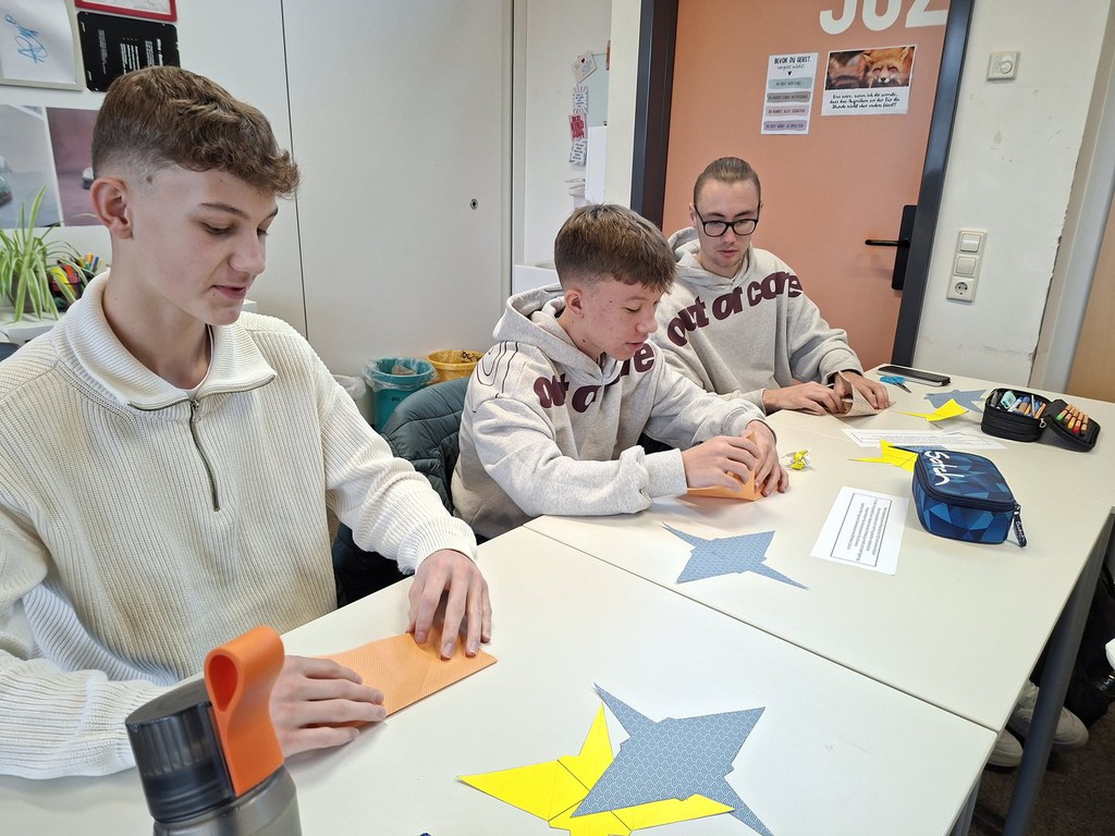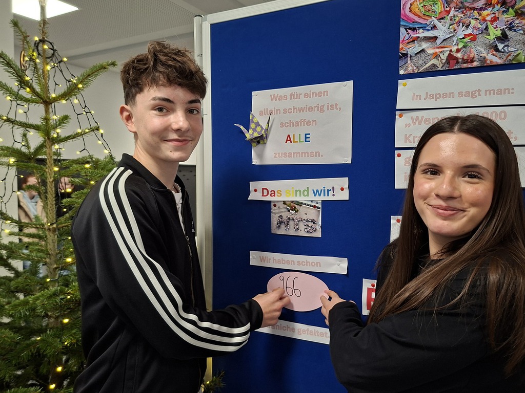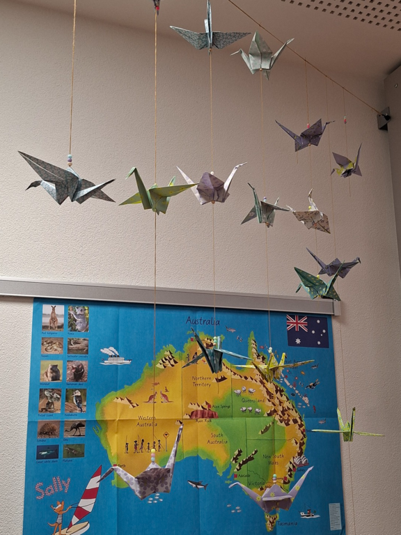 In der Adventszeit falteten die Schülerinnen und Schüler der Hans-Thoma-Schule Laufenburg über 1 000 Papierkraniche, um ihrem Wunsch nach Frieden Ausdruck zu verleihen. Diese Tradition aus Japan geht auf das Mädchen Sadako Sasaki zurück. Sie überlebte als Zweijährige den Abwurf der Atombombe auf die Stadt Hiroshima im August 1945. Zehn Jahre später erlag sie in Folge der radioaktiven Strahlung einer Leukämieerkrankung. In Japan sagt man, dass derjenige einen Wunsch erfüllt bekommt der 1 000 Origami-Kraniche faltet. Nach einer Überlieferung schaffte sie nur 644, bervor sie starb. Ihr Klassenkameraden sollen die restlichen Kraniche gefaltet haben. Seither legen Schülerinnen und Schüler im Friedenspark in Hiroshima als Symbol für Frieden Kraniche nieder. Schulleiter Fabian Zoller-Wunderlich besuchte in den Herbstferien im Rahmen einer Studienfahrt des Masterstudiengangs Schulmanagement und Leadership der Universität Tübingen Japan. Dabei erfuhr er von Sadakos bewegender Geschichte und kam auf die Idee, daraus eine Adventsaktion an der HTS zu machen. Auch an unserer Schule gibt es Kinder, die aufgrund von Krieg ihre Heimat verlassen mussten. Die Aktion steht für den Zusammenhalt der Schulgemeinschaft. Zusammen wurde etwas geschafft, das einer alleine nicht erreichen kann. Bis zum letzten Schultag vor den Weihnachtsferien kamen über 1 300 Kraniche zusammen.